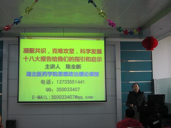 12月21日下午,第三临床学院在图书馆一楼报告厅举行“十八大精神”宣讲会,报告由思政课部陈全新博士主讲,学院教工支部成员及学生党员聆听了报告。
